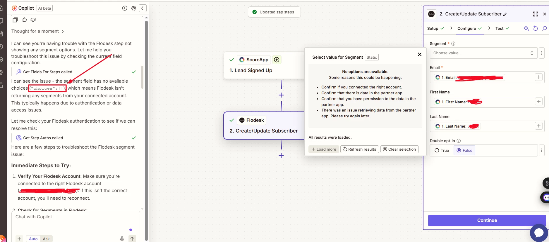 I am attempting to create a new Zap to add a subscriber from Storeapp into Flodesk. Both applications are connected and configured correctly. However, when setting up the action, the segment list from Flodesk does not populate, even though segments exist in my Flodesk account. Here is the screenshot for reference: https://prnt.sc/1fKzAECAbb0B