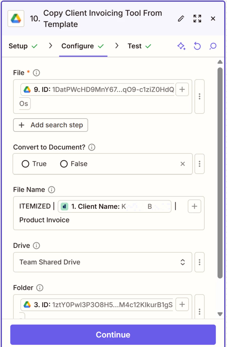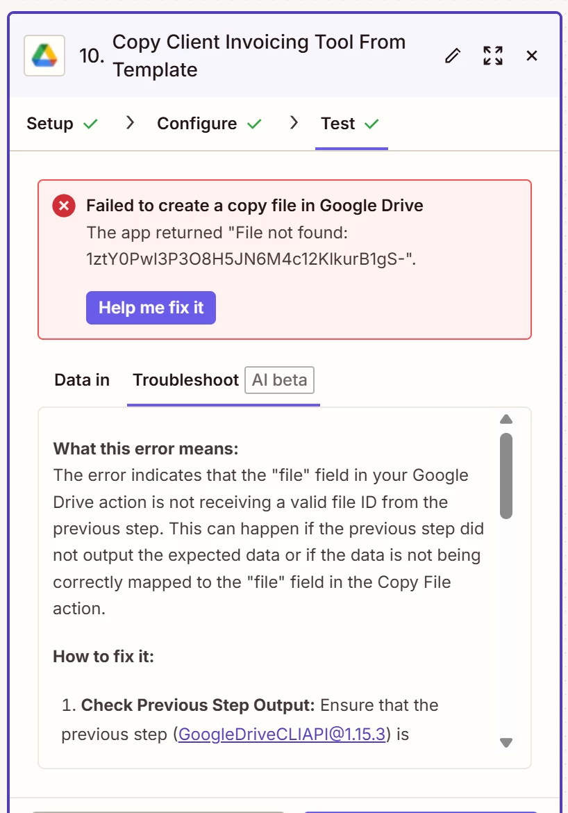 I first added a search step that prompts the Zap to find the template Google Sheet. From there, I copy the template Google Sheet, rename it using a client’s name, and then want to move the named copy to the same client’s folder. The client folder was created in an earlier step in the same Zap (see configuration in first screenshot below). I specify a custom destination folder using the folder ID from the previous step in the Zap, but it’s still rendering the error message that the file was not found (see second screenshot below).