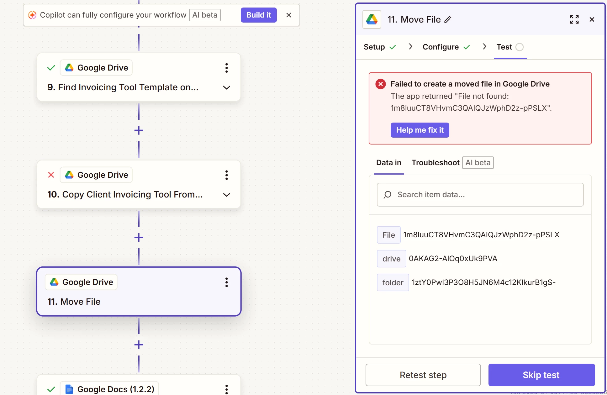 Make sure the GDrive File ID being used to test the Zap steps still exists.