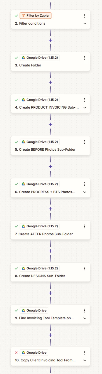 And here’s a full outline of the zap. Once a client signs the contract in Dubsado, the Zap puts a filter on the trigger to confirm it’s a client contract signed, then creates a folder for the client, and a number of subfolders within that same, named client folder. From there, it finds the Google Sheet template, copies that and renames it in the client’s name. Now I just want to move that named client Google Sheet to the client’s folder created in step 3.