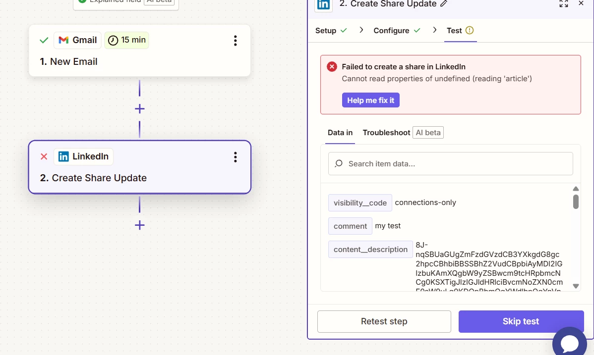 I am trying to trigger a Linkedin post when a email is received in my Gmail. But when I configure the “Create share update” Step “configure” I am setting the “Content - Description” to the Gmail “Body Plain” attribute, and in the “Comment” attribute I am passing some text. However when I perform the test it always gives me an error “Cannot read properties of undefined (reading 'article')”. I dont find any Article attribute in the list of fields. I am attaching the screenshot of the error