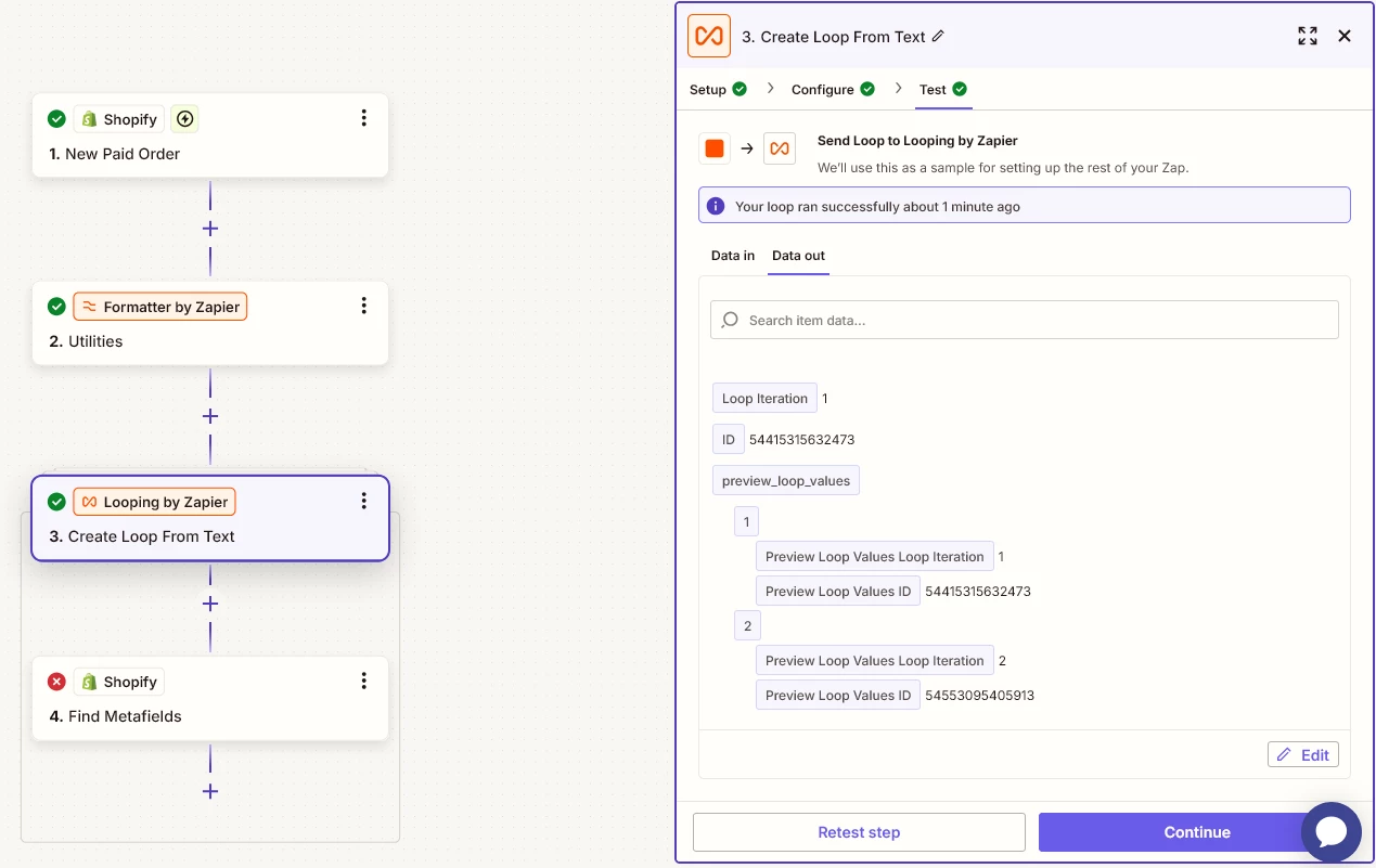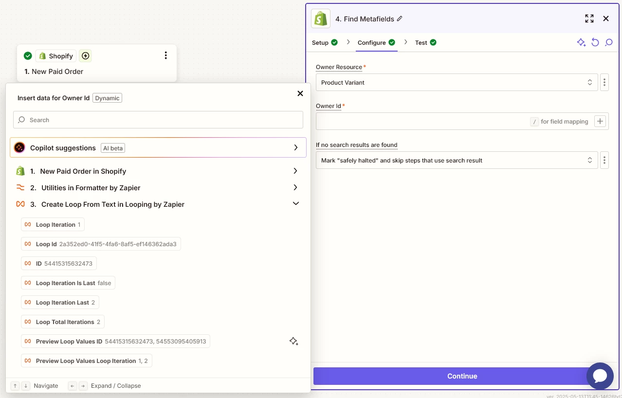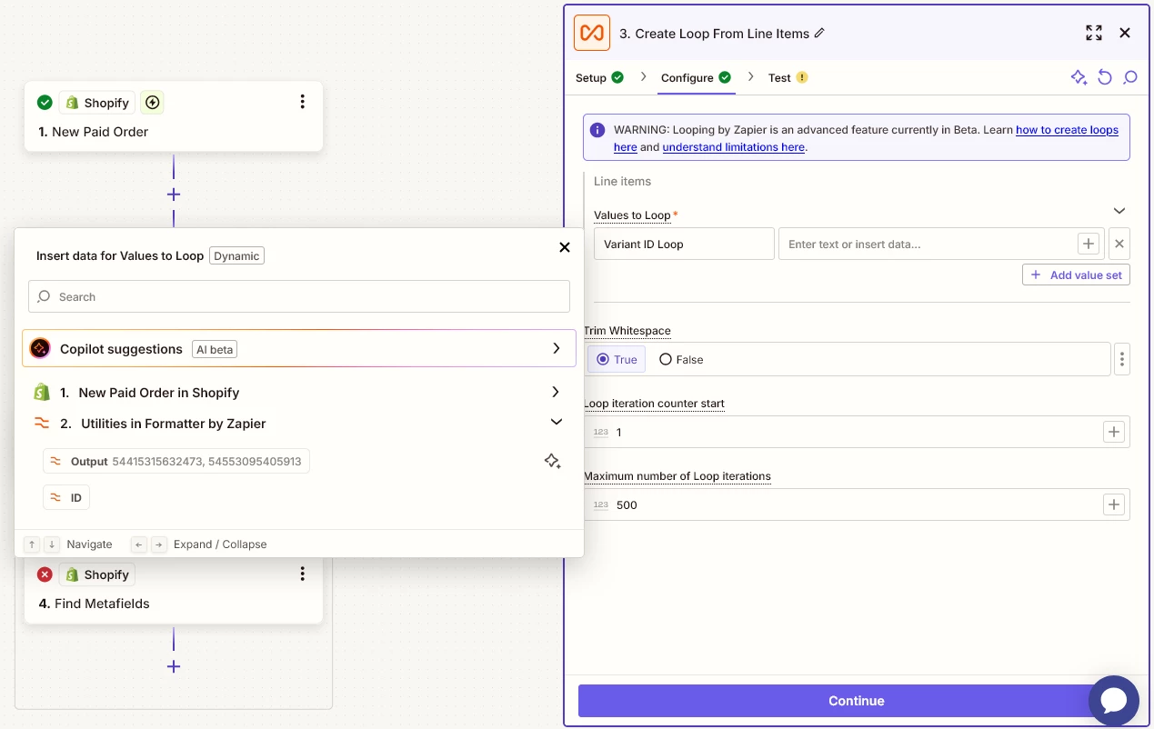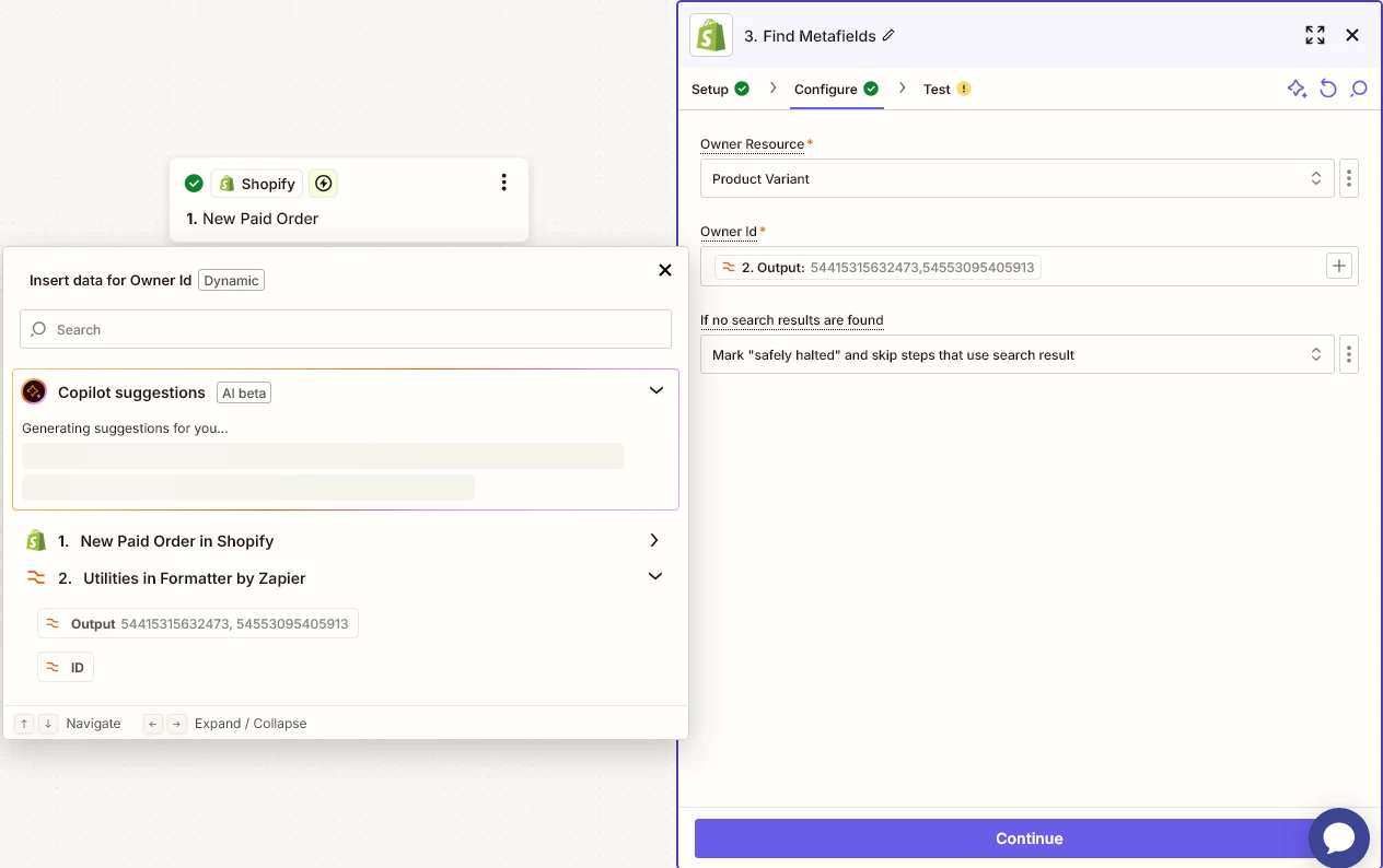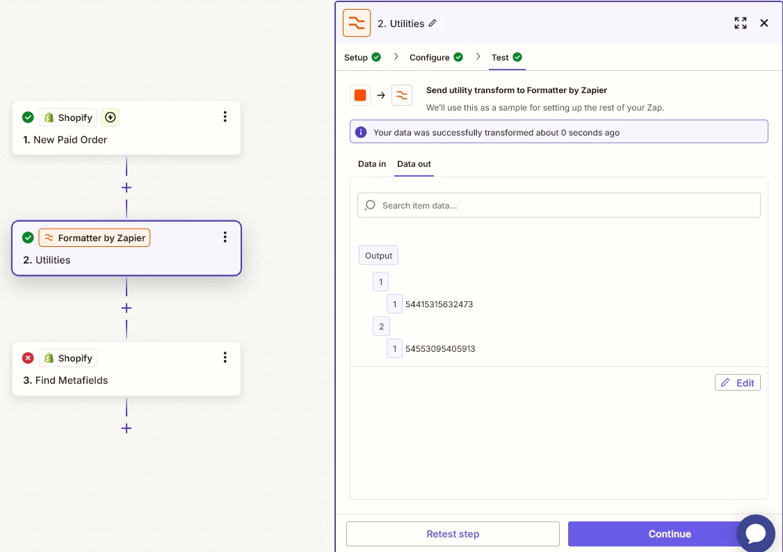 I’ve got a problem with shopify metafields. I cannot seem to find a way to search for than one. I’m using find metafields and I think the first issue is that the data is intepreted as a string despite using formatter utility to transform text into line-items. I am attaching screenshots to with my current setup.
