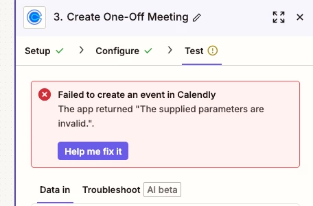 I Need help with calendly i keep getting this error for an automated link to be sent for schedule. I have the paid version on calendly and still i cant run a successful test.