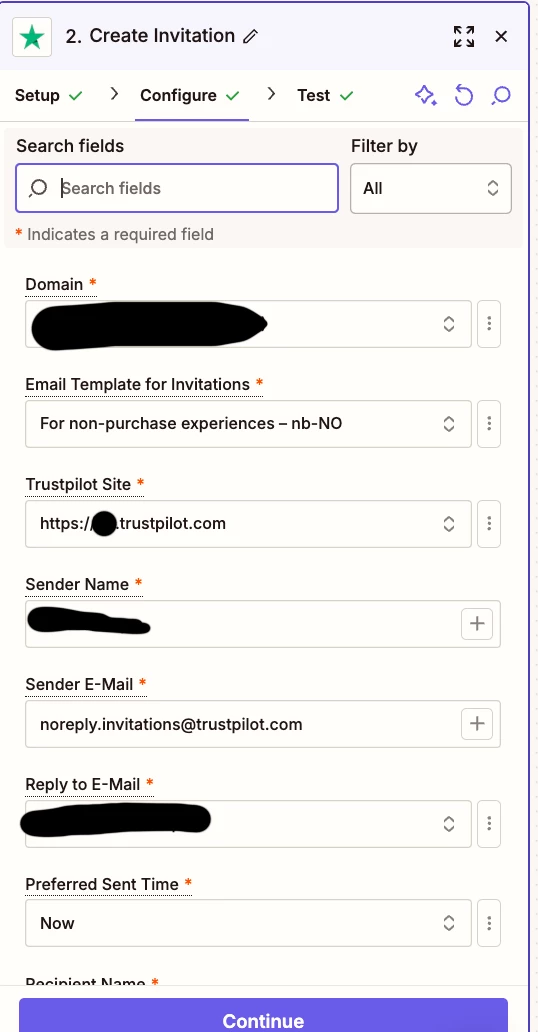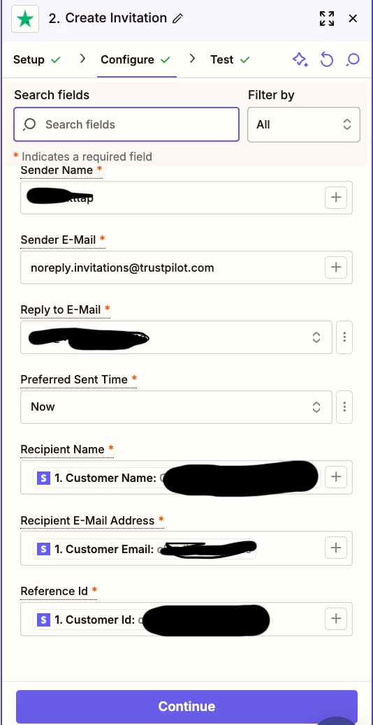 The error you're encountering when trying to create an invitation in Trustpilot indicates that the Zap is unable to retrieve the necessary data from the previous step. Specifically, the fields for "recipientName," "recipientEmail," and "referenceId" are expected to be populated with data from the previous step, but it seems that the values are not being passed correctly.”