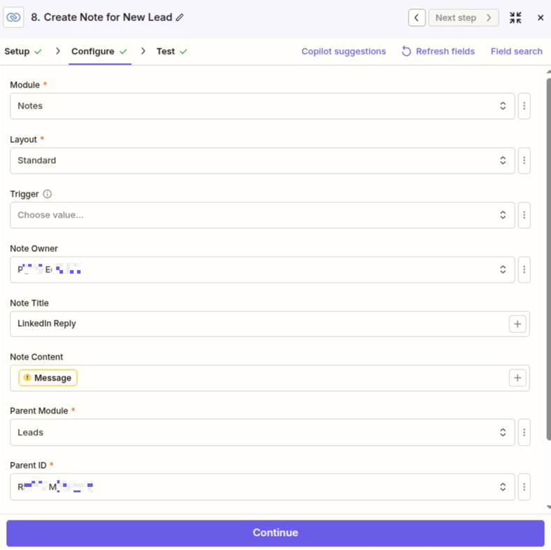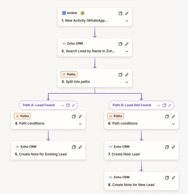 I created Zaps to add Notes in CRM when there is a response by a lead from a lemlist campaign. When the lead does not exist in my crm.zoho it creates one and adds a note. There are 3 zaps for replies by LinkedIn, Whatsapp or email.