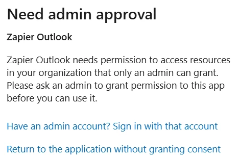 Hello! I am trying to connect my Zapier account to my Outlook account to setup a series of automations. It is a business account, and we already have an automated inbox account setup and working. But I need these automations to work specifically for my inbox. Every time I go in to try and connect it though, I get a message about needing Admin approval. My company’s outlook/365 admin has added every Zapier permission he can find, but for some reason, every time we try to add my email to Zapier, it says that permission is required for Zapier for Outlook.