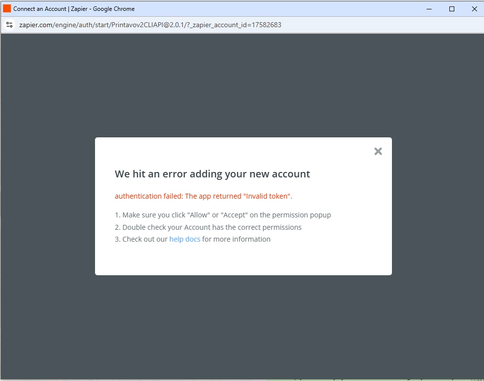 We've attempted to connect our Printavo account through Zapier multiple times, but each attempt results in an authentication error. The error message states: "authentication failed: The app returned 'Invalid token'."
