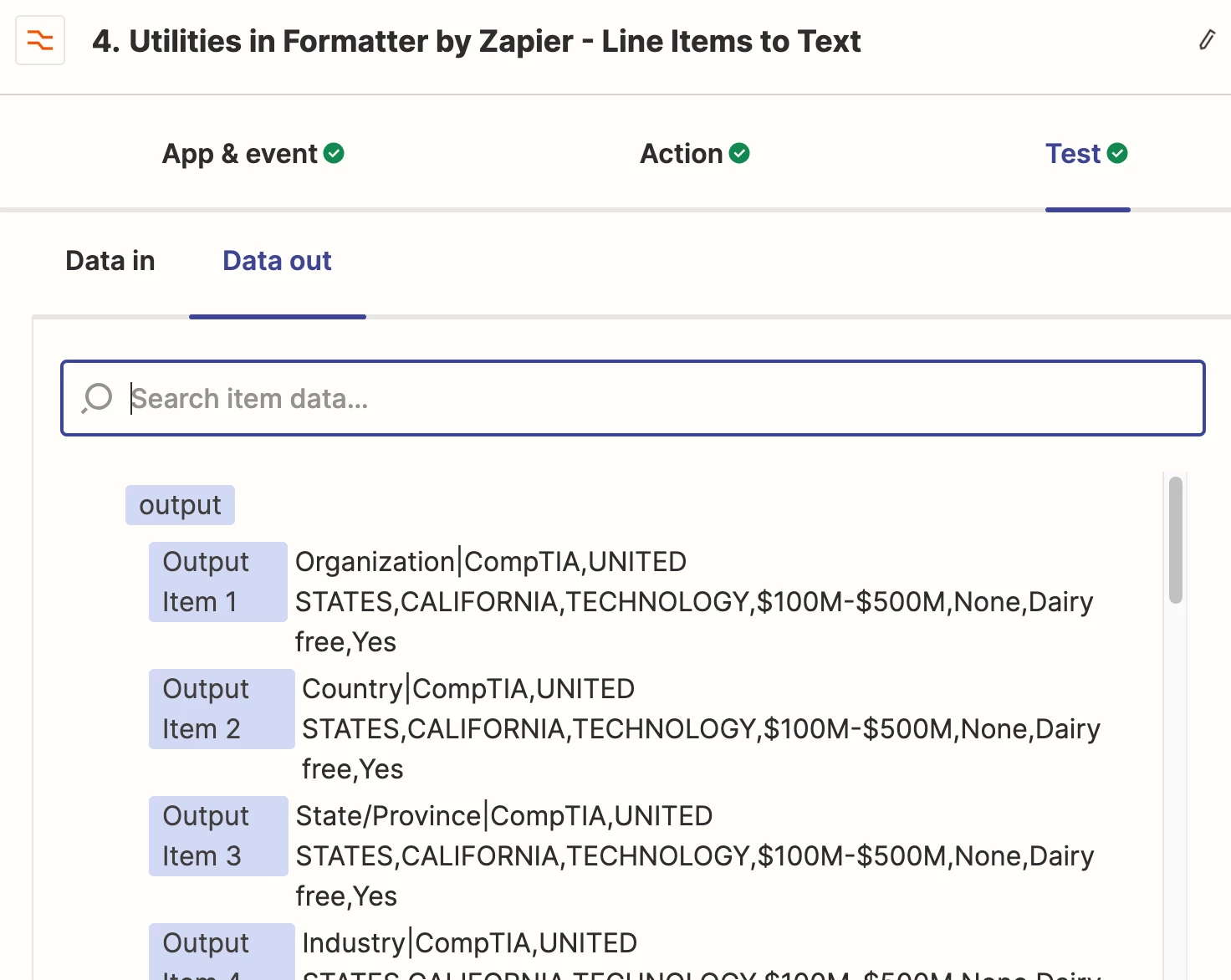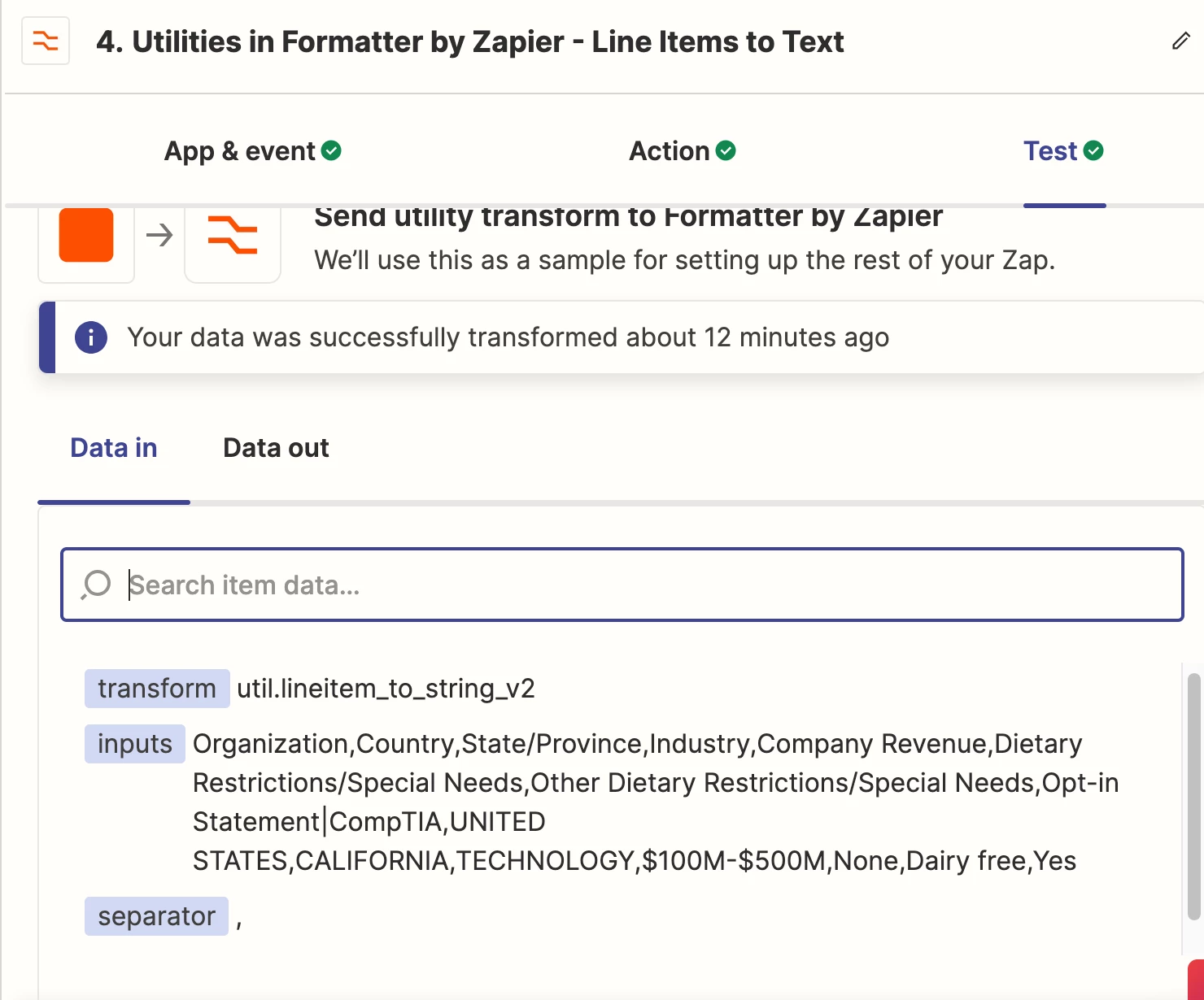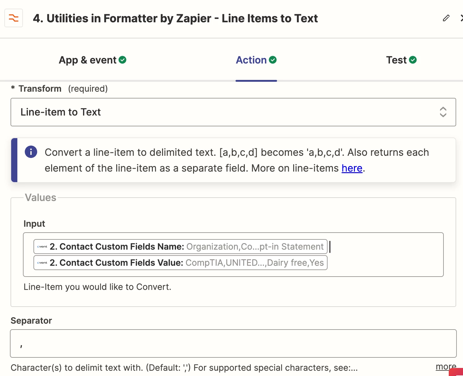 I’m using the Utilities in Formatter by Zapier - Line Items to Text to parse the questions and answers. The ‘question’ portion outputs correctly, however, the ‘answer’ portion is resulting in an incorrect result -- it keeps outputting all the answer values vs the corresponding one. The separator is a comma. How do I get the ‘answer’ portion to output correctly?