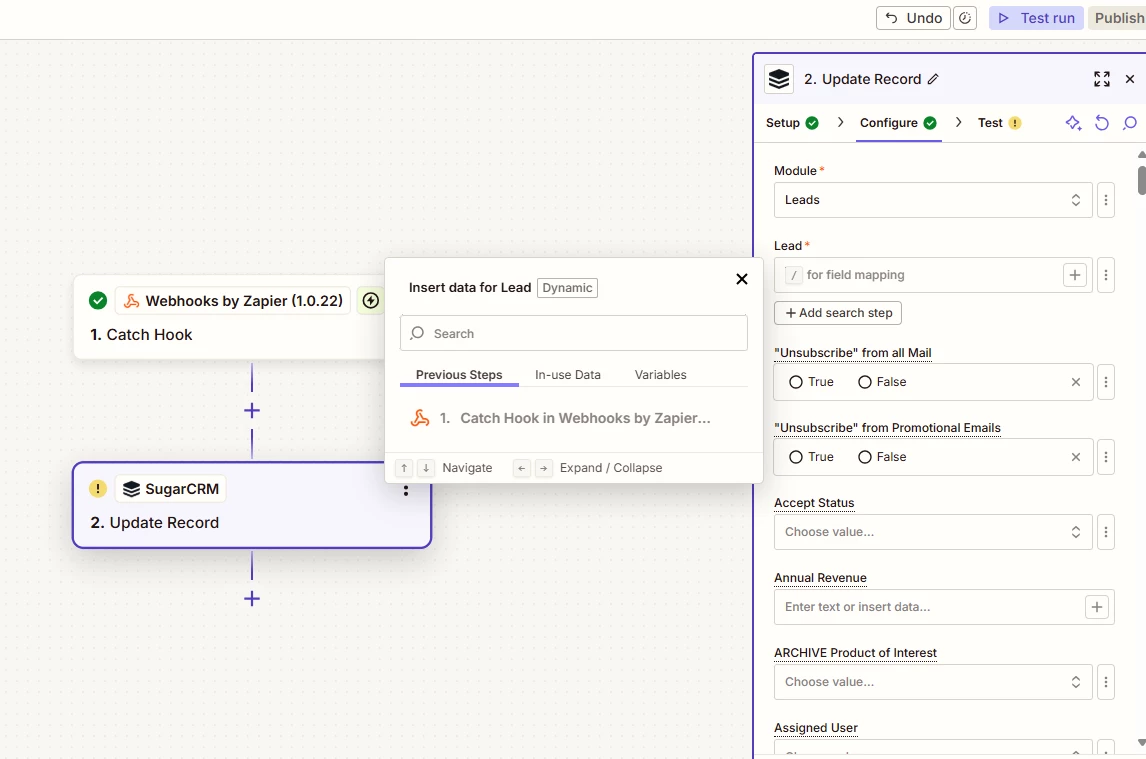 I am trying to utilize a catch hook trigger to update data fields within a CRM record. When getting data to my catchhook, I’m unable to utilize the data that was passed as a dynamic input into my Update Record action. Any ideas on why the webhook data is greyed out?
