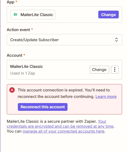 Mailerlite Classic has been working fine up until the email structure that I pull data from changed and I needed to update the zap. Now I can not get mailerlite classic to connect.