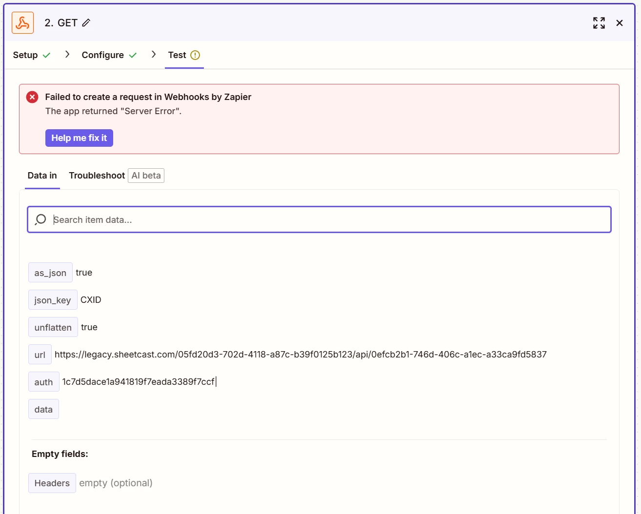 While creating a test Zap to connect Stripe with a Sheetcast app. I found that the Get Action of a custom Webhook would return a server error if it is immediately preceded by the Stripe Trigger. If I add any step in between or use a different trigger with the same Get Action the Get behaves normally.
