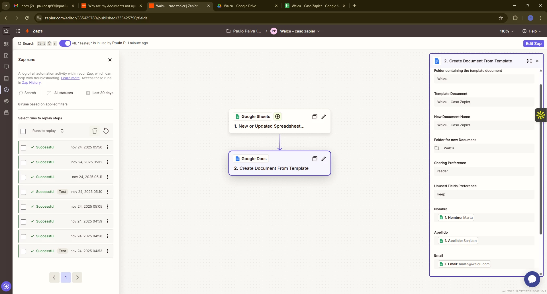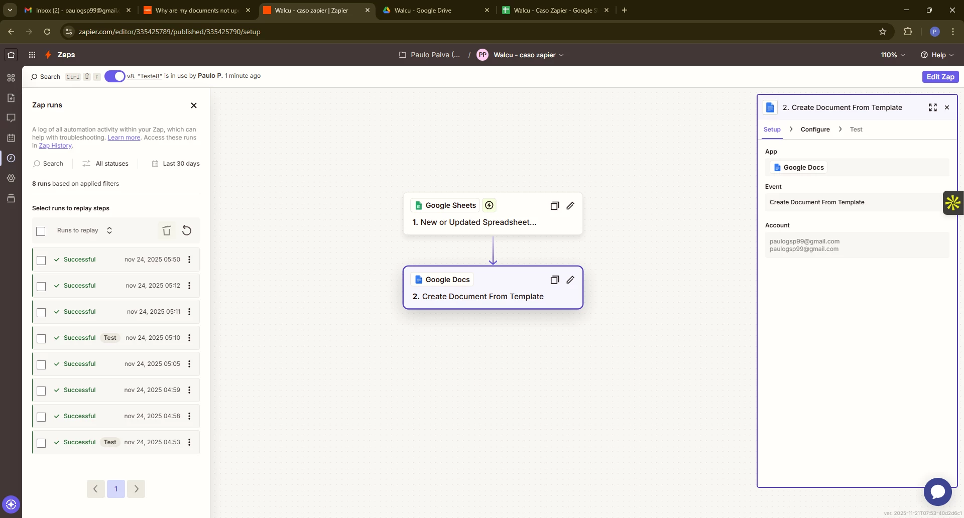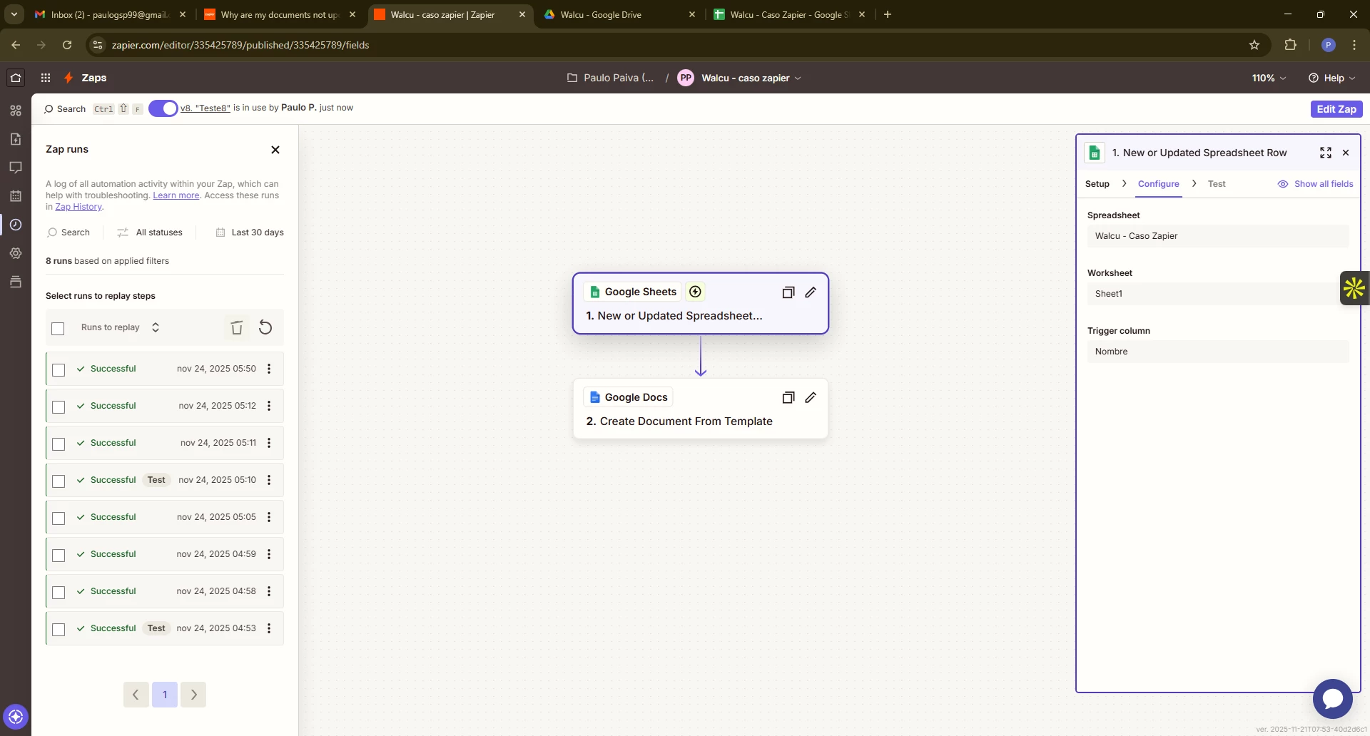 I created a simple Zap where I have my spreadsheet in Sheets and when I make any update, I want my Docs to be updated as well.