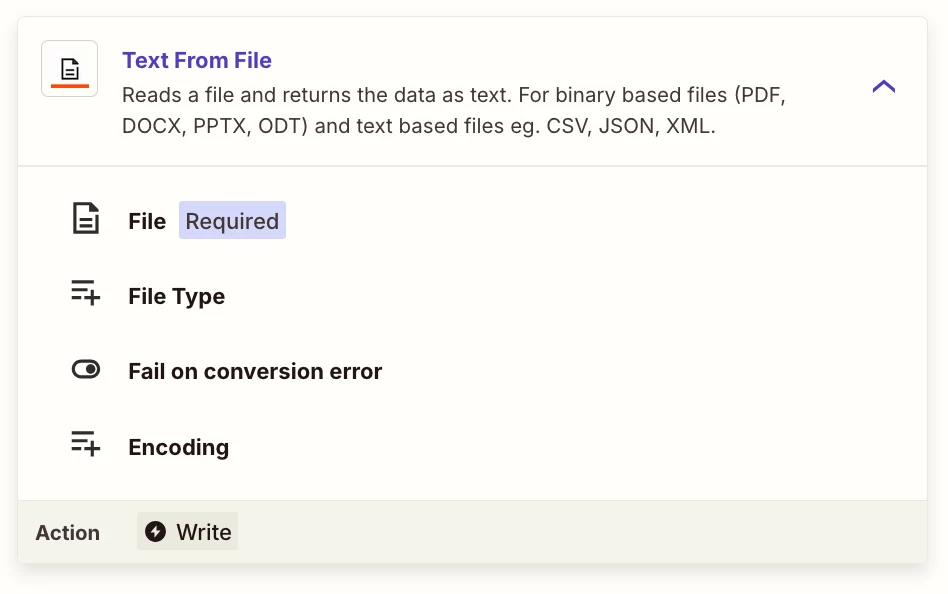 object from whatever earlier step is generating the file. This will extract the raw text from the file, which you can then pass in as a plain text input to your main AI by Zapier step that summarises or does other stuff with the text.