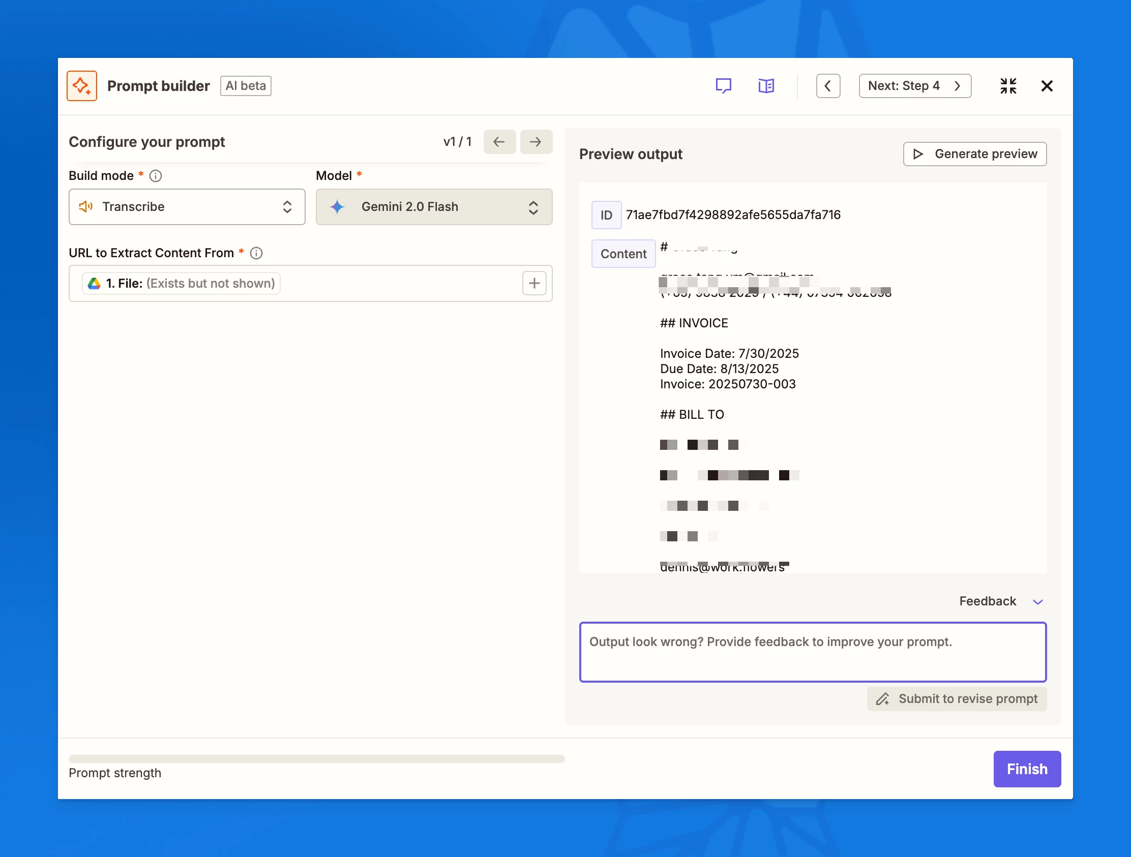 Insert another AI by Zapier step with the Transcribe action, and in the URL to Extract Content From