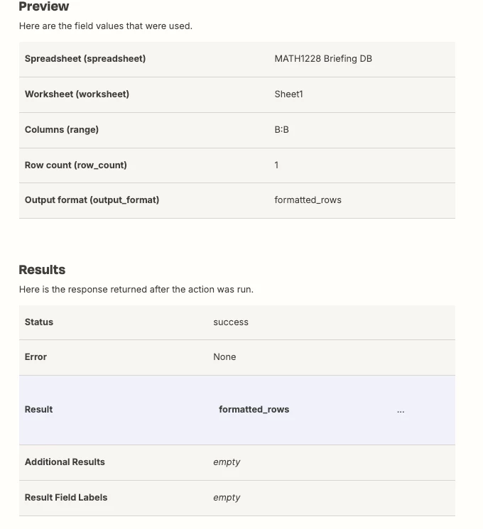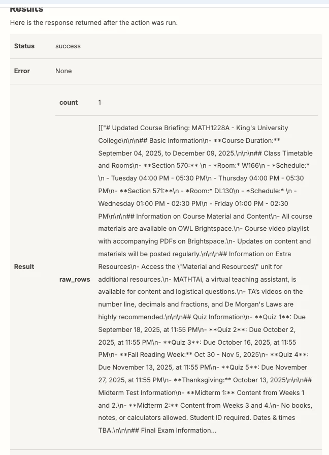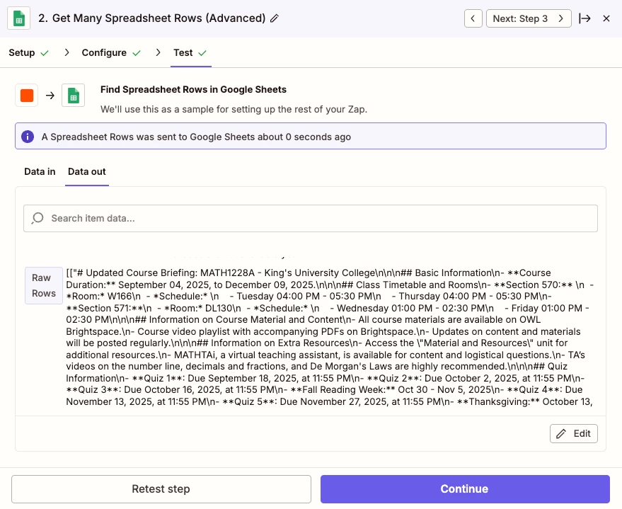 No, I did not display the entire raw text—I stopped at the “Final Exam Information...” because the result received from the action was cut off (indicated by the ellipsis ...). The raw output I got from Zapier ended there; I did not remove or skip any content.