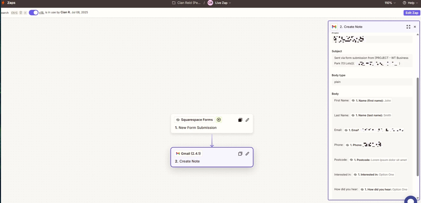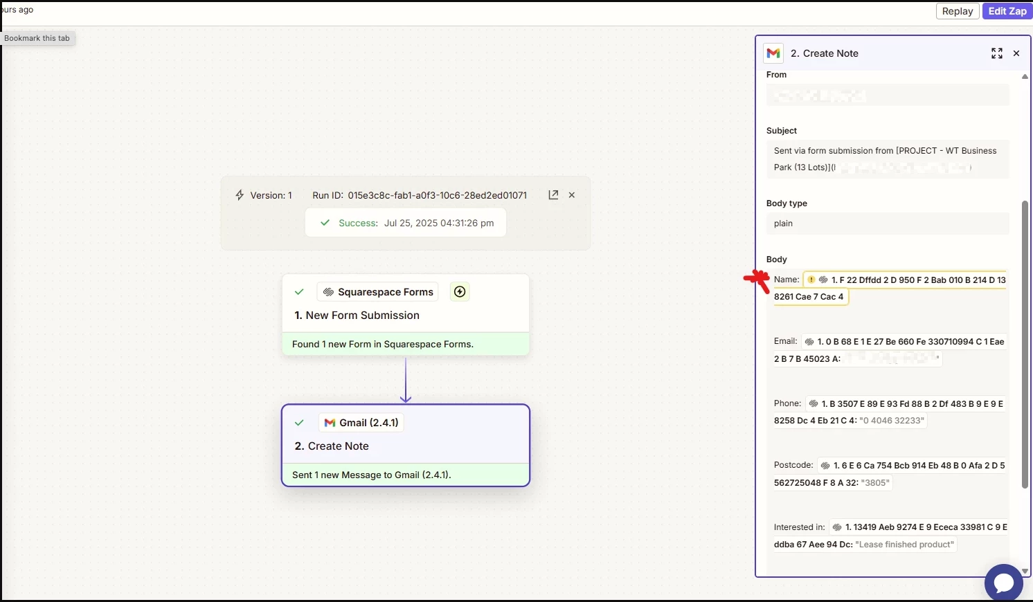 I have set up a Zap that sends an email from my gmail account once a squarespace form is triggered. In the email, all of the answers in the form show up correctly except for the name of the user, which remains blank. I have no idea why it remains blank as it is set up the same as the other answers