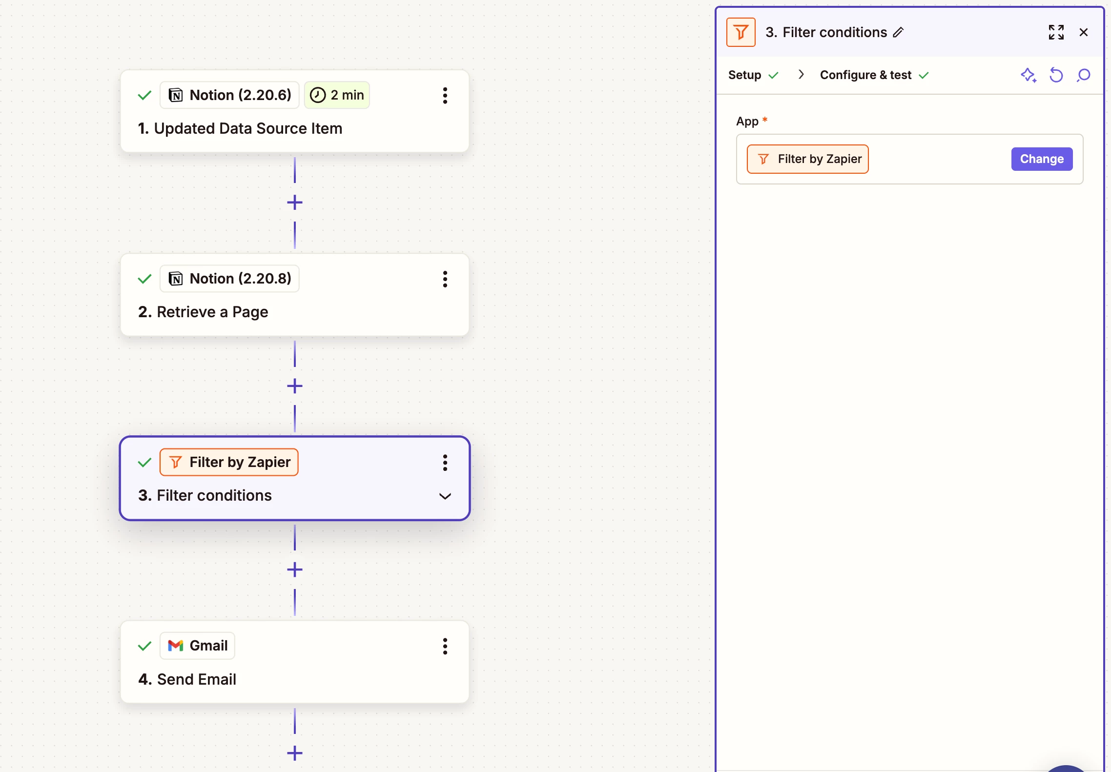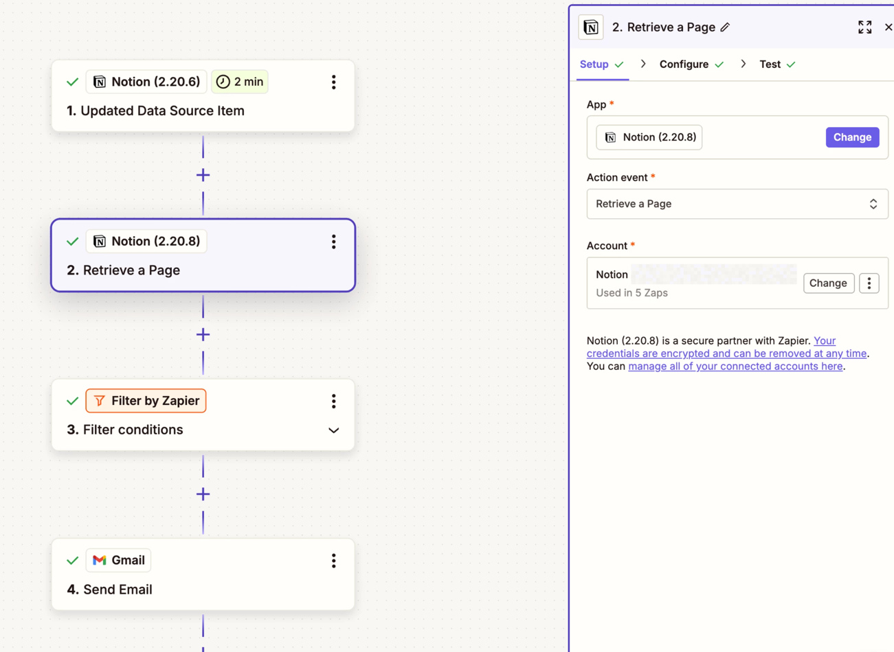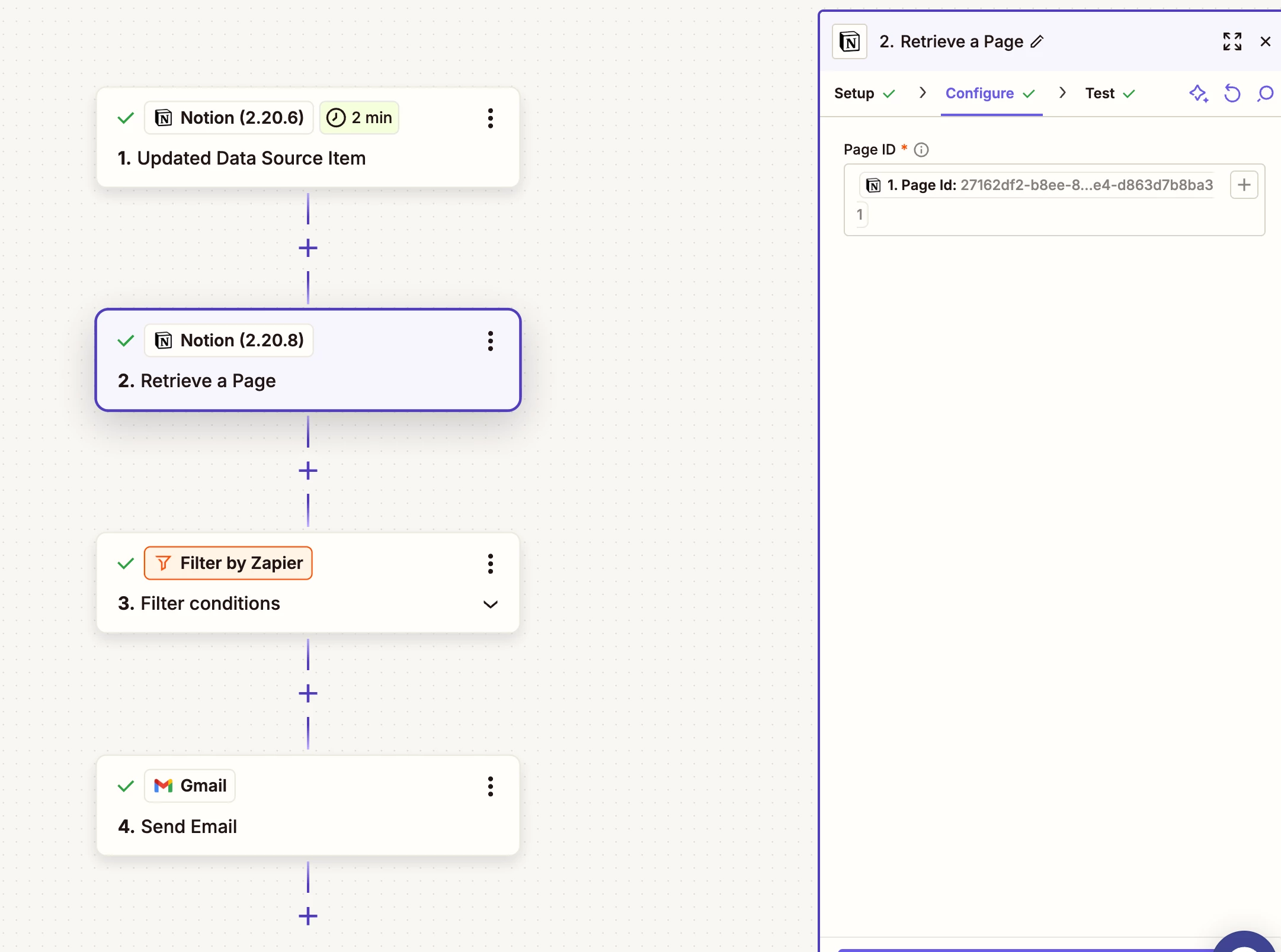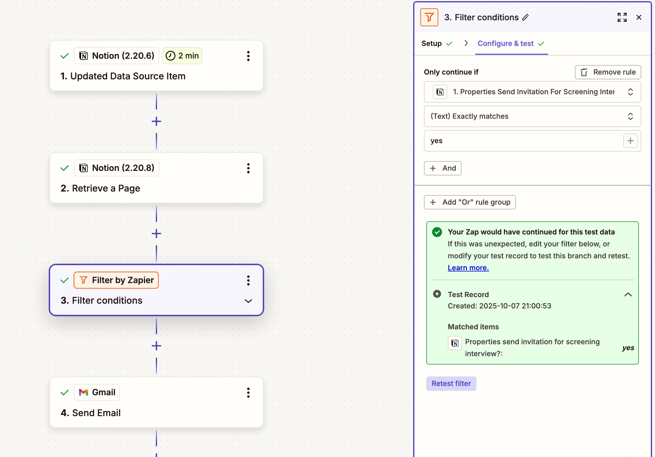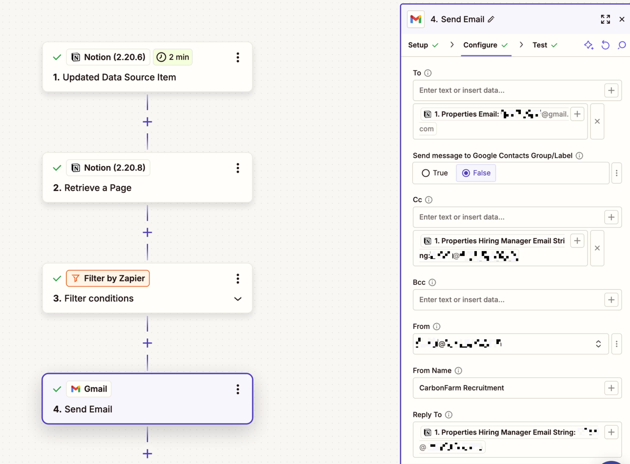 - Retrieve a Page in Notion, specifically to extract some content that is used to craft the email, such as email copy and proposed interview slots. I don’t know why this doesn’t come through with the trigger, but it does seem to come through with the retrieve a page operation.