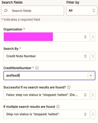 I am testing out Zapier to do some credit note allocations. Unfortunately, the search doesn’t seem to be working correctly. At the moment, it is returning ALL credit notes, regardless of what you pass in as a parameter.