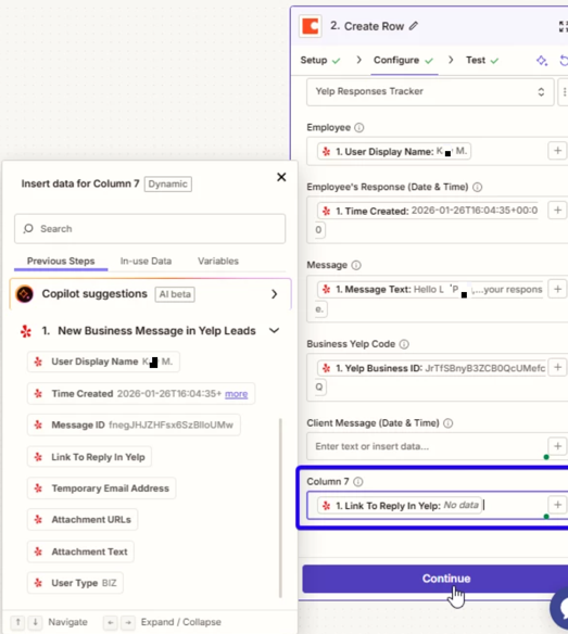 I’m creating a new row in Coda for each response our team sends to Yelp customers. I have a column that should populate with the link to the message reply, but it’s showing “No Data.” What am I missing?