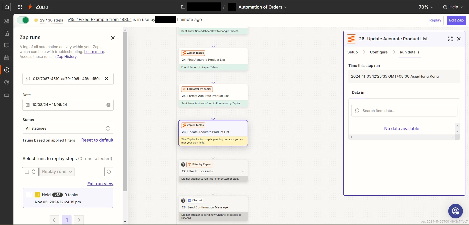 I am in the trial version of the Professional plan and I have built a Zap integration. The Zap was running fine yesterday but now after making some minor changes it is held about 75% of the way through with the warning: This Zapier Tables step is pending because you have met your plan limit. However, we are not even close to reaching our task limit (204 / 2,000). There is no other explanation provided anywhere else on Zapier as to what limit it is referring to.