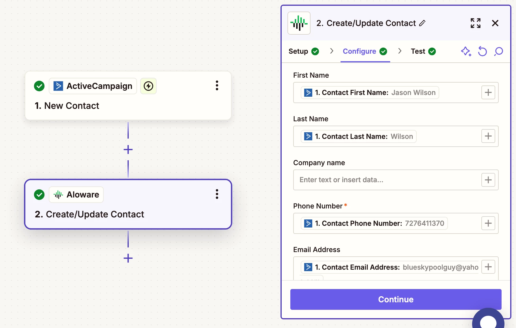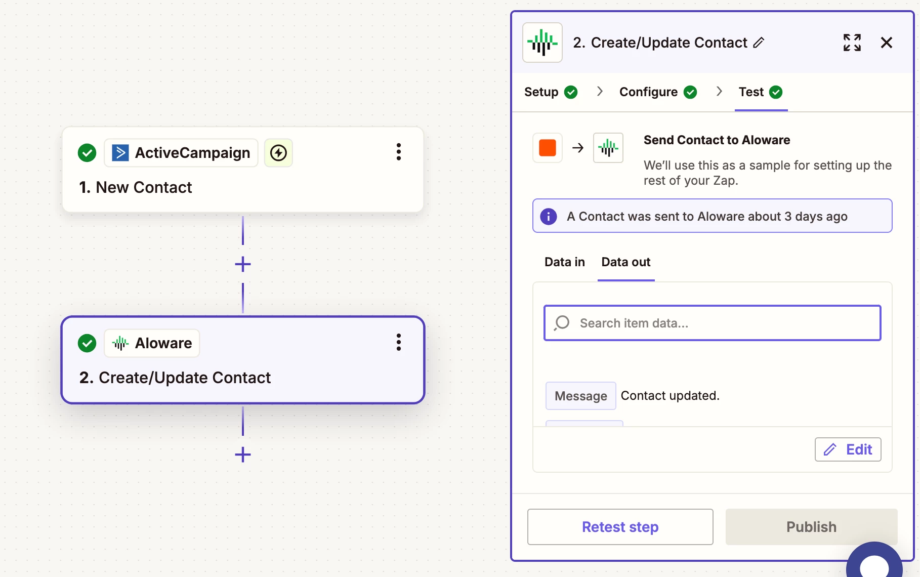 When I “test” the zap, the contact from AC successfully gets sent to Aloware. I’ve done that twice now.