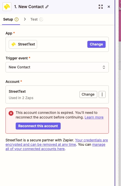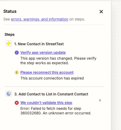 "My StreetText step keeps showing 'This account connection has expired' even though the step tests successfully and the account is connected. The Zap won't publish because of this blocking validation error. Can you clear this flag so I can publish?"