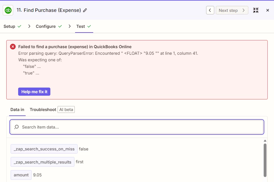 I am using the QuickBooks Online “Find Purchase (Expense)” step in Zapier, and the test fails whenever I search using an amount. The error is: QueryParserError: Encountered "<FLOAT> "9.05 "" ... Was expecting "false" or "true"