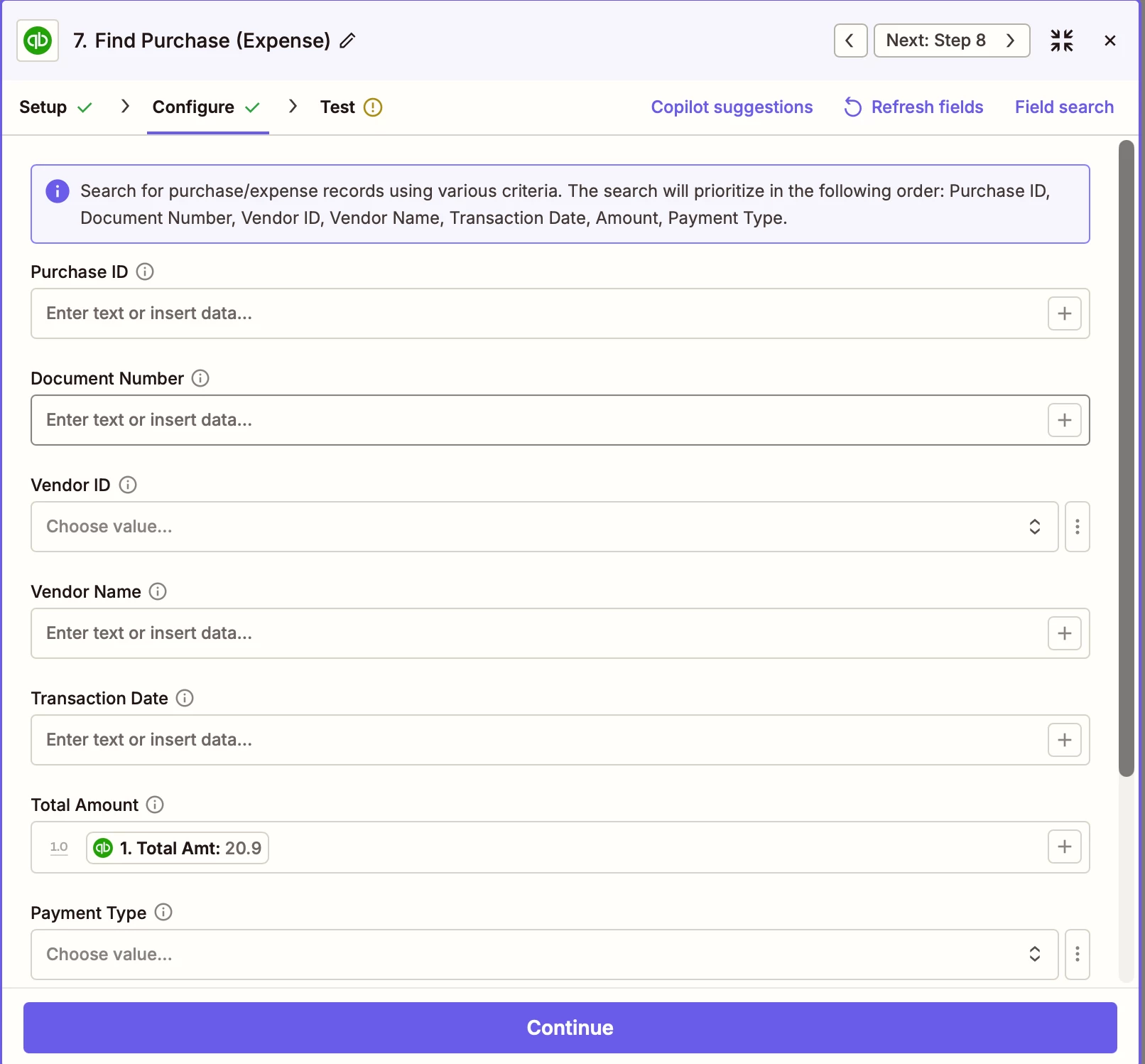 Zapier QuickBooks Online: Find Purchase (Expense) breaks on amount field with QueryParserError