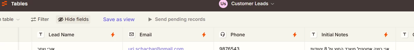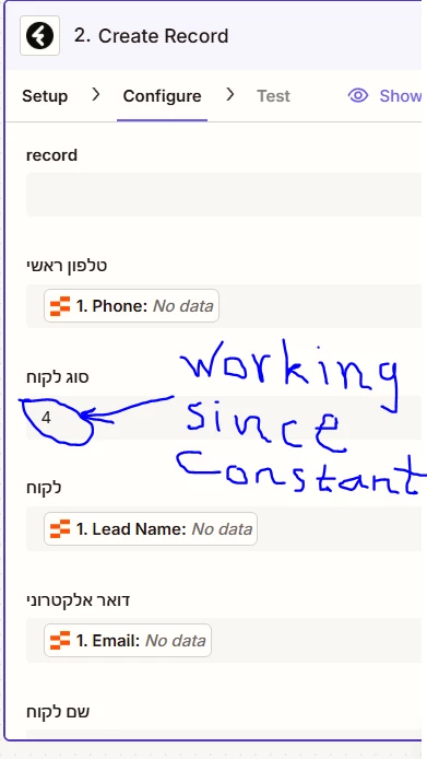 Zapier table doesn't deliver the field to fireberry new customer record