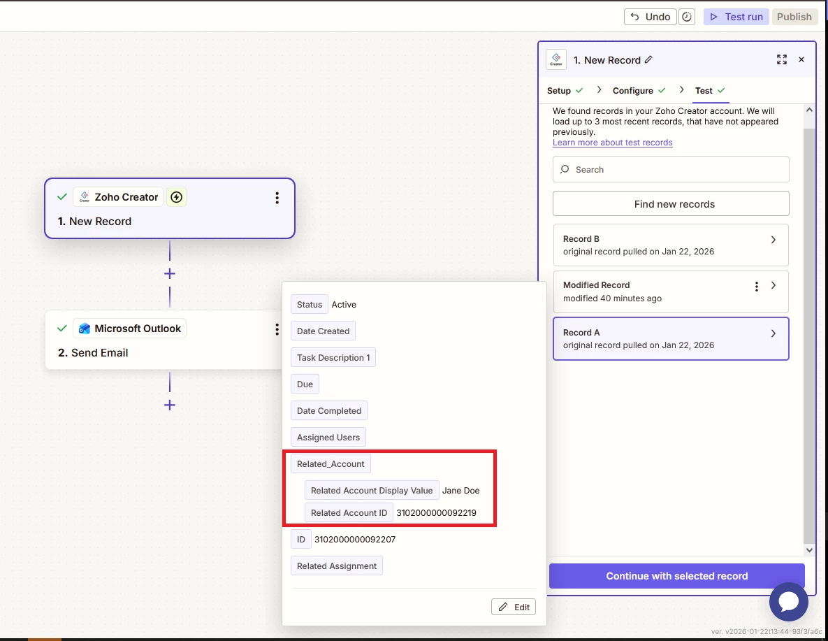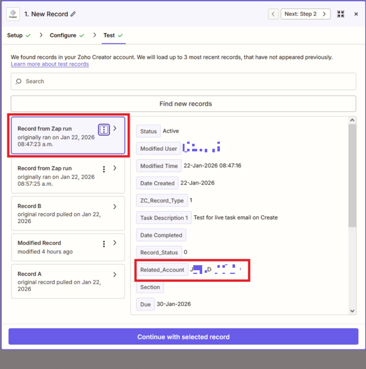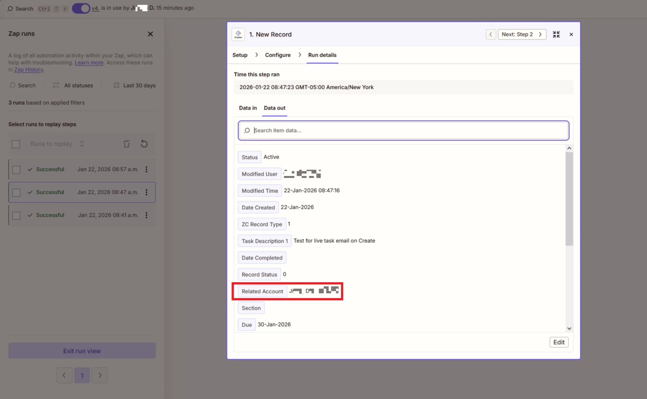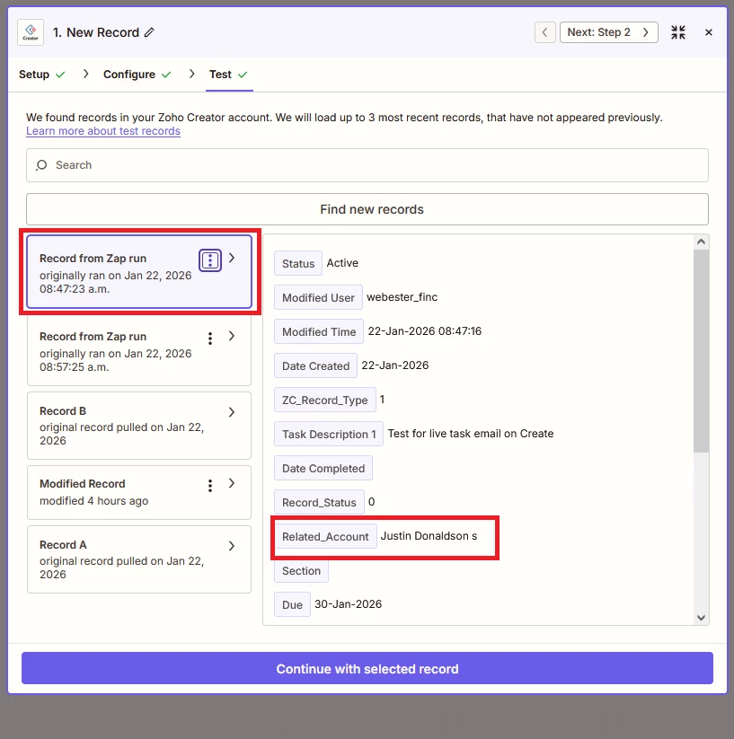 The image below displays 3 records (all of which are the same) that are using an inaccurate data structure to the ACTUAL Task database in Zoho Creator. Specifically the structure of the Related Account field shows a Display Name. However in the next image, we show an Actual record that was pulled in via a LIVE test of the zap. So my questions are: