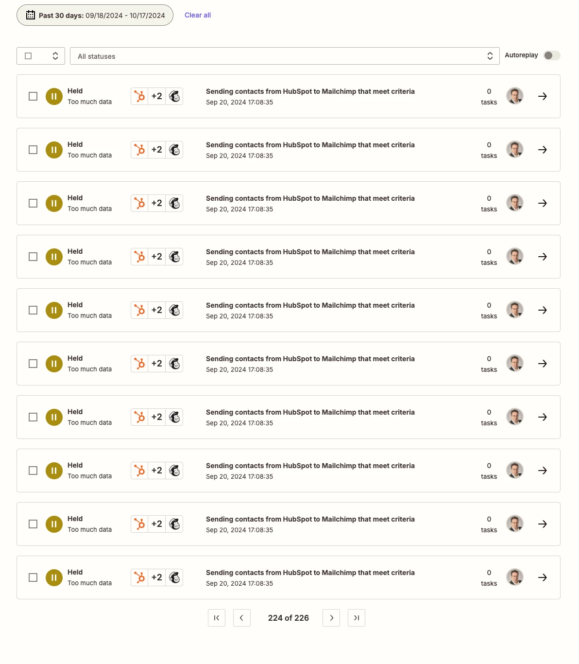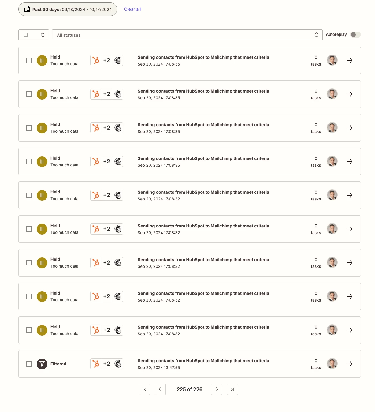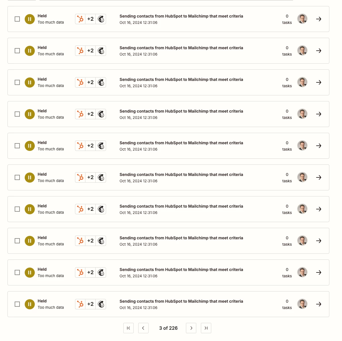 I have automation set up: when specific criteria in HubSpot is met, sent contract details to MailChimp. My plan is Pro (750 tasks). Since this automation was set, outside of couple of test tasks, NO HubSpot criteria were met to trigger this Zap worked. But I’m receiving this error consistently. WHY? HOW TO SOLVE IT? Thanks