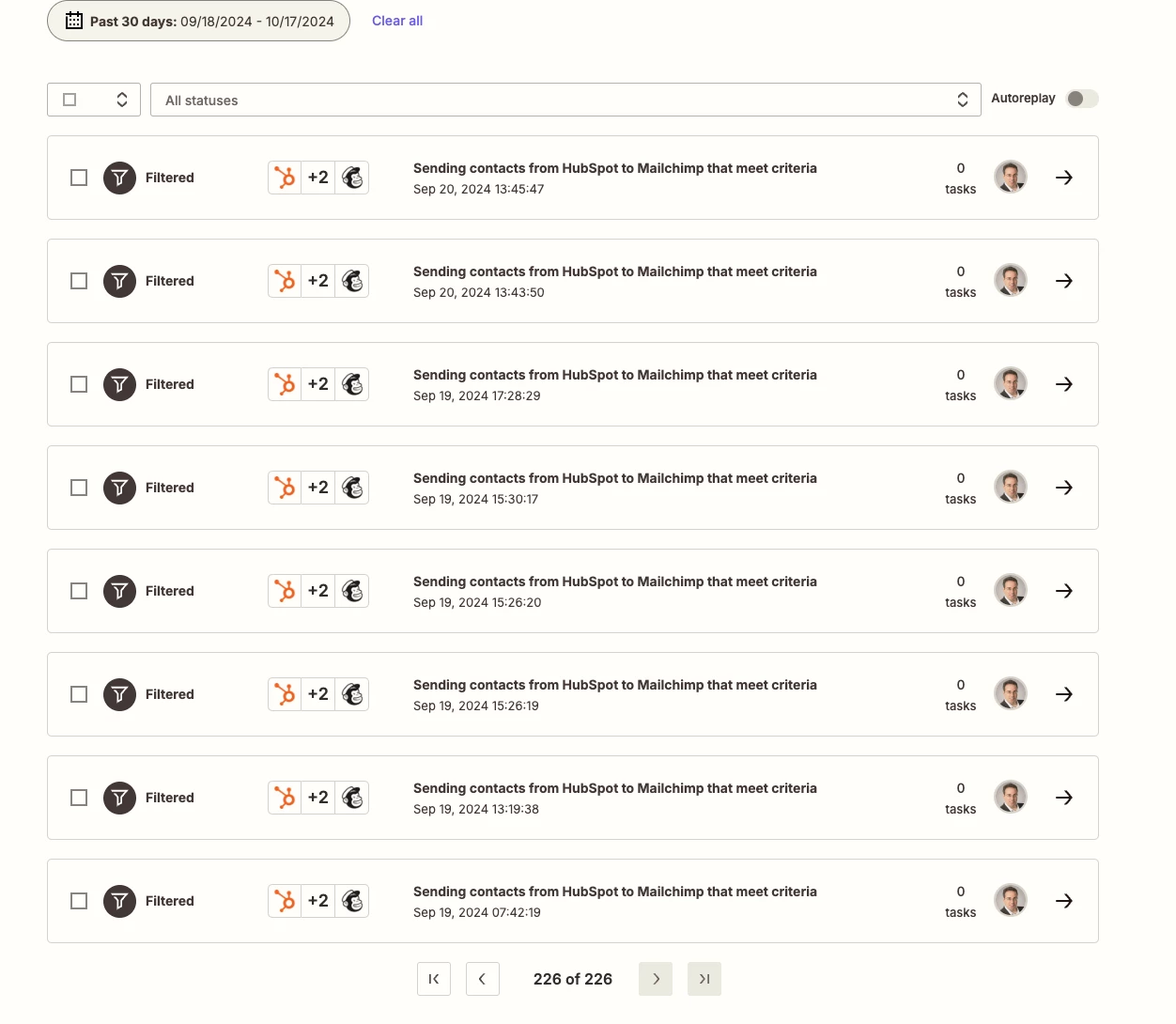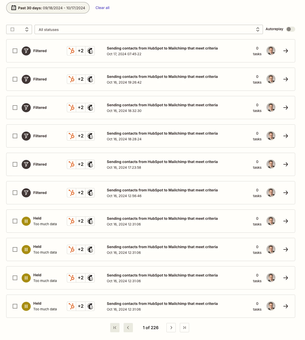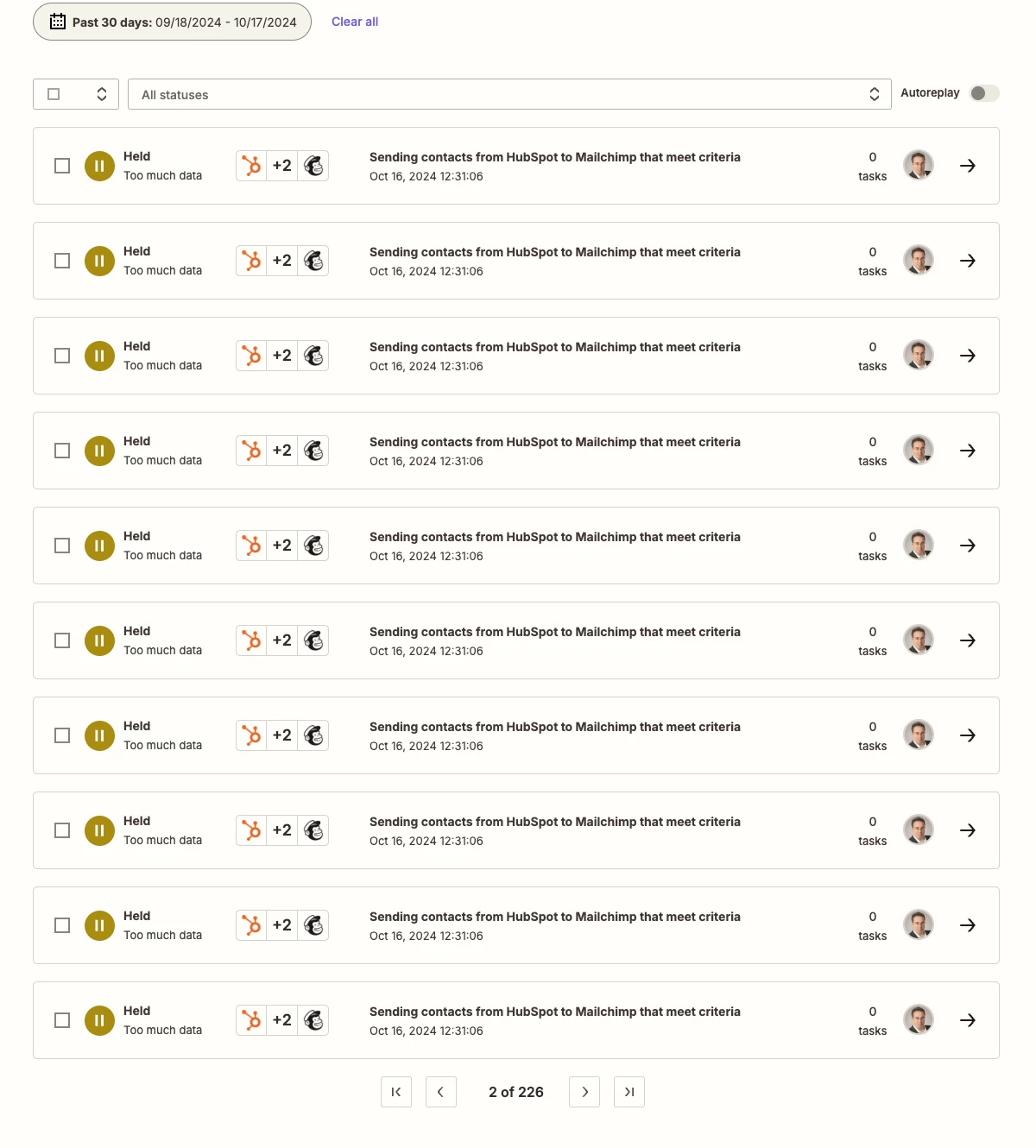I have automation set up: when specific criteria in HubSpot is met, sent contract details to MailChimp. My plan is Pro (750 tasks). Since this automation was set, outside of couple of test tasks, NO HubSpot criteria were met to trigger this Zap worked. But I’m receiving this error consistently. WHY? HOW TO SOLVE IT? Thanks