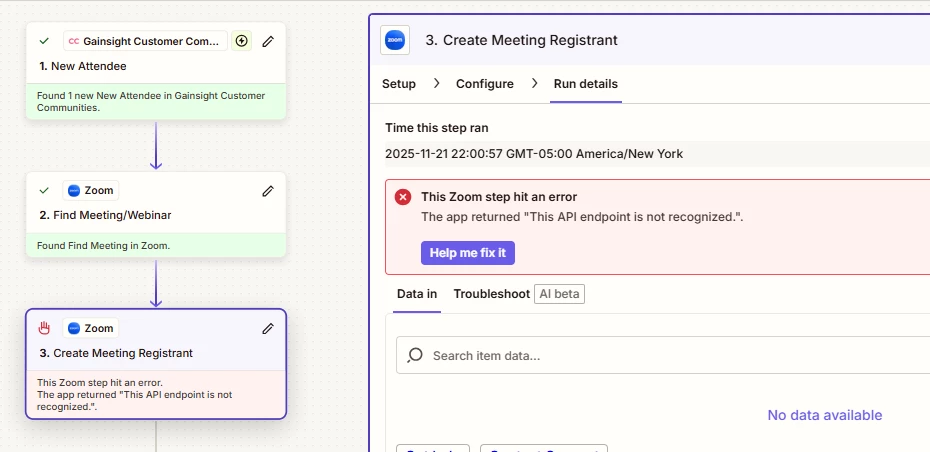 Since Nov 13th, I am getting the following error The app returned "This API endpoint is not recognized.". when trying to add a registrant to a Zoom Meeting.